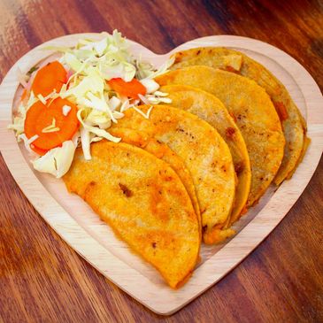 Available flavors: chicharrón, potato, bean, chorizo with potato, and chicken.